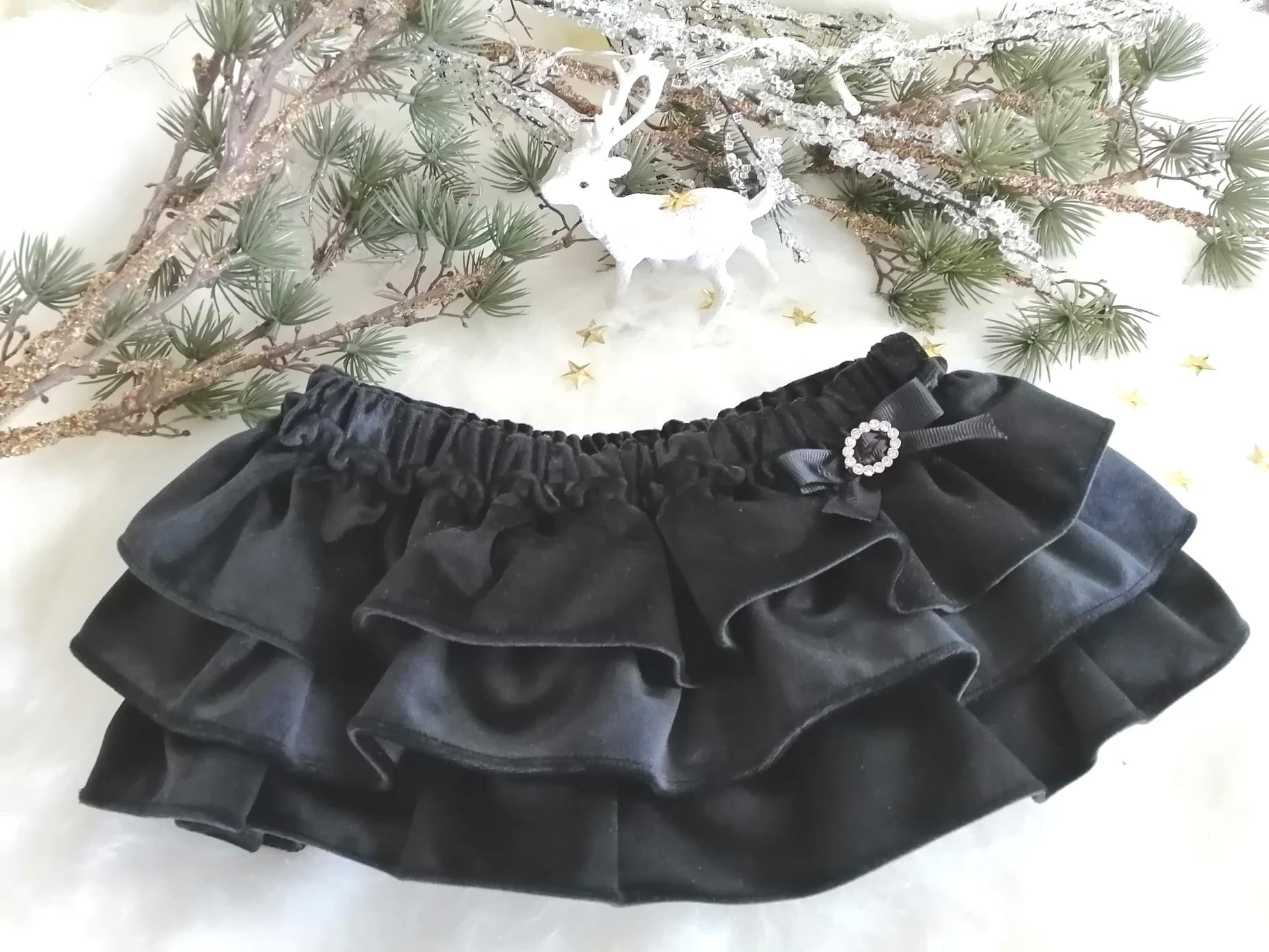 Schwarze Bloomers für kleine Mädchen. Sie sind aus weichem Samt gefertigt.